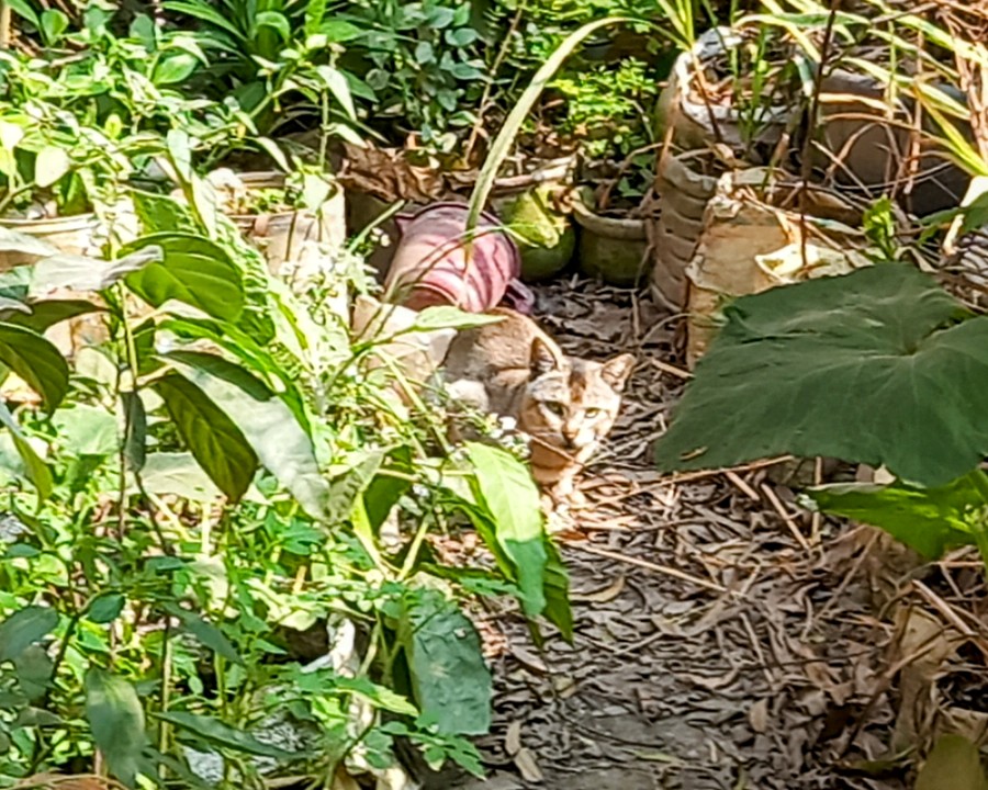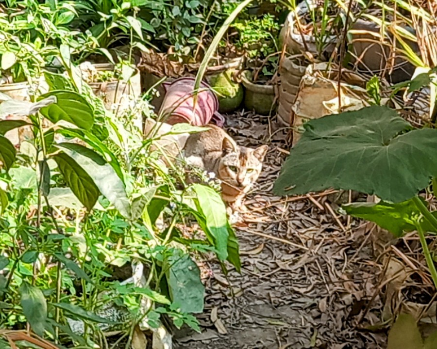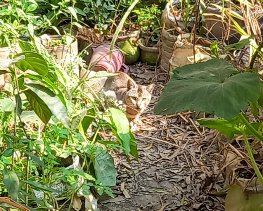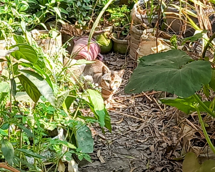 What you see in the picture is our family tub garden. Here a wild cat 🐱 🐈 is sitting and waiting. Seeing me, he stands and watches my movements.