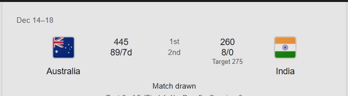 Australia went into bat in the 2nd innings leading by about 185 runs. In the 2nd innings, he scored 89 more runs, lost 7 wickets, and declared a target of 275 runs and sent India into bat. As there was no time in the 2nd innings, the match umpire declared the end of time by scoring 8 runs in 2.1 overs. As a result, Australia had to accept the draw result, a little away from victory.