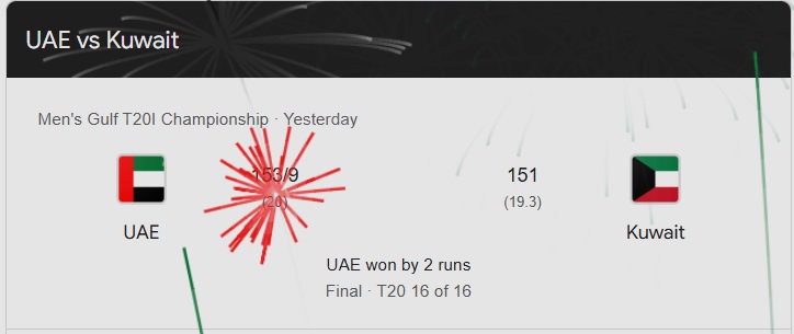 মেন্স গল্ফ টি ২০ চ্যাম্পিয়নশিপ ফাইনাল খেলায় গতকাল রাতে মুখোমুখি হয়েছে দুই শক্তিশালী দল আরব আমিরাত বনাম কুয়েত। শ্বাসরুদ্ধকর এই ফাইনাল ম্যাচে মাত্র ২ রানে হেরে গিয়ে চ্যাম্পিয়ন থেকে বঞ্চিত হয় কুয়েত। টসে জিতে ব্যাটিংয়ের সিদ্ধান্ত নেই আরব আমিরাত। দারুন ফর্মে থাকা আরব আমিরাতের Tanish Suri এর ব্যক্তিগত ৩৪ রান ,Rahul Chopra এর ব্যক্তিগত ২৮ রান এবং Alishan Sharafu এর ব্যক্তিগত ২৮ রানের উপর ভিত্তি করে ১৫৩ রানের ফাইটিং স্কোর করে আরব আমিরাত। বলার একশনে Yasin Patel ব্যক্তিগত তুলে নেন ৩ উইকেট ,Sayed Monib তিনিও তুলে নেন ৩ উইকেট এবং Meet Bhavsar তুলে নেন ২ উইকেট।