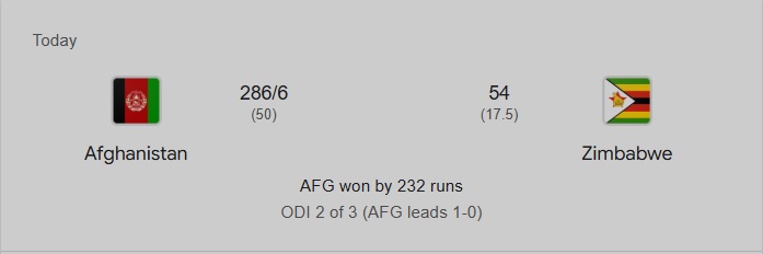 Batting with a target of 287 runs, Zimbabwe lost the opening wicket and stumbled. In 17.5 overs where Zimbabwe needs to score 287 runs, all the wickets were lost and Zimbabwe's innings ended with only 54 runs. As a result, Afghanistan got a huge victory of 232 runs. Afghanistan got an incredible victory in history. The Zimbabwe cricket team lost the shameful loss in history.