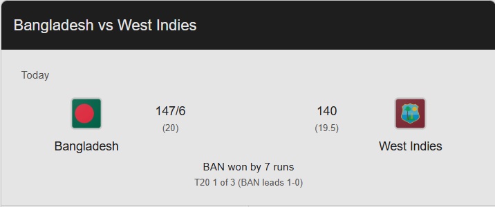 After winning the toss and deciding to field, the West Indies team needs only 148 runs to win. The West Indies cricket team stumbled at the start of batting. The West Indies cricket team was under a lot of pressure after losing wickets in a few runs. Rovman Powell's personal 35-ball 60-run innings, Romario Shepherd's personal 17-ball 22-run innings and Johnson Charles' personal 12-ball 20-run innings only 7 runs behind the West Indies cricket team's total of 140 runs. West Indies cricket team lost by only 7 runs, as a result, Bangladesh cricket team took a step forward in winning the series by winning the 1st match in the 3-match series.