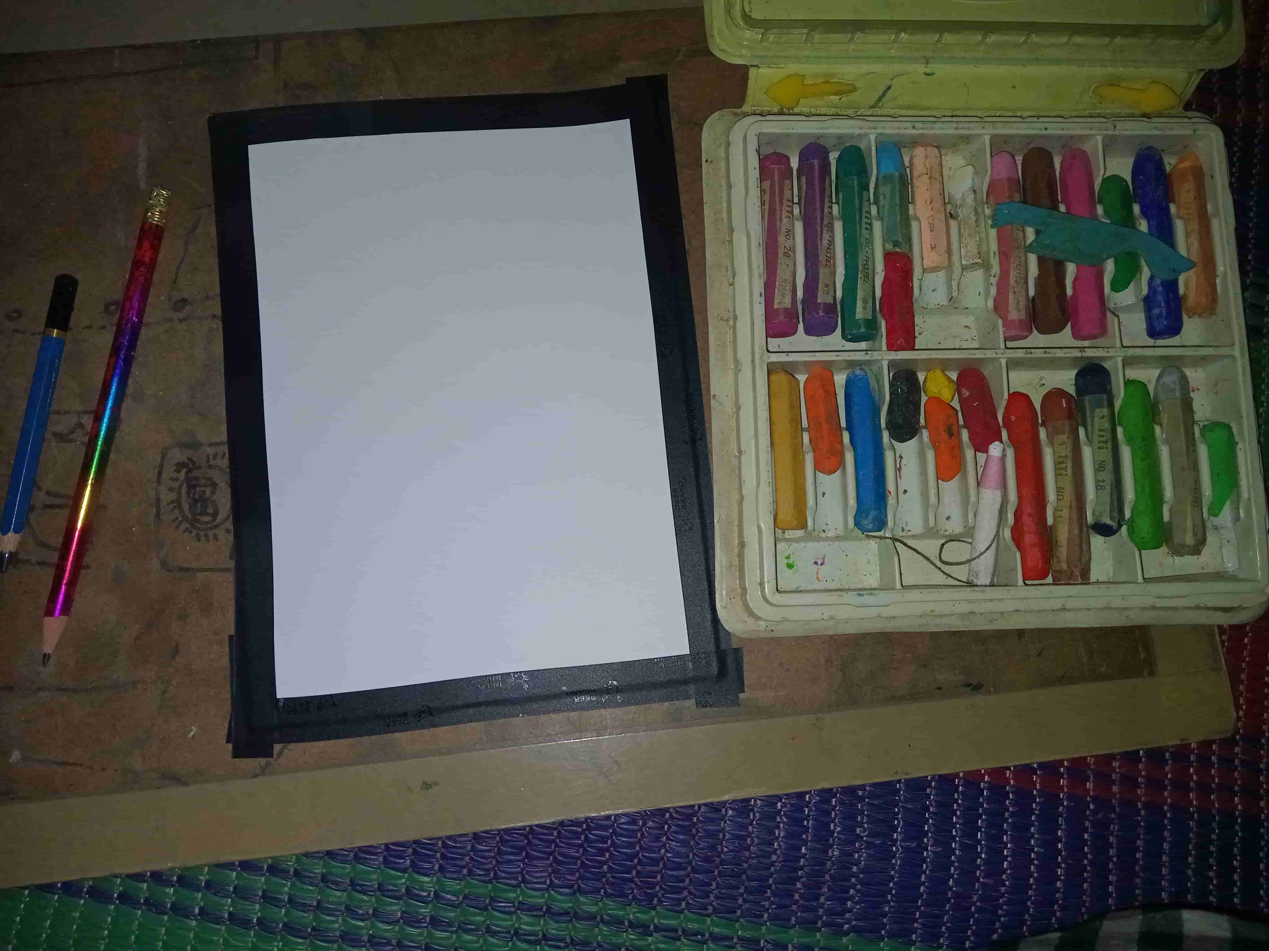 First I took all the drawing materials. Then I taped the paper to the drawing board. I put tape around it so that it looks good after removing the tape.