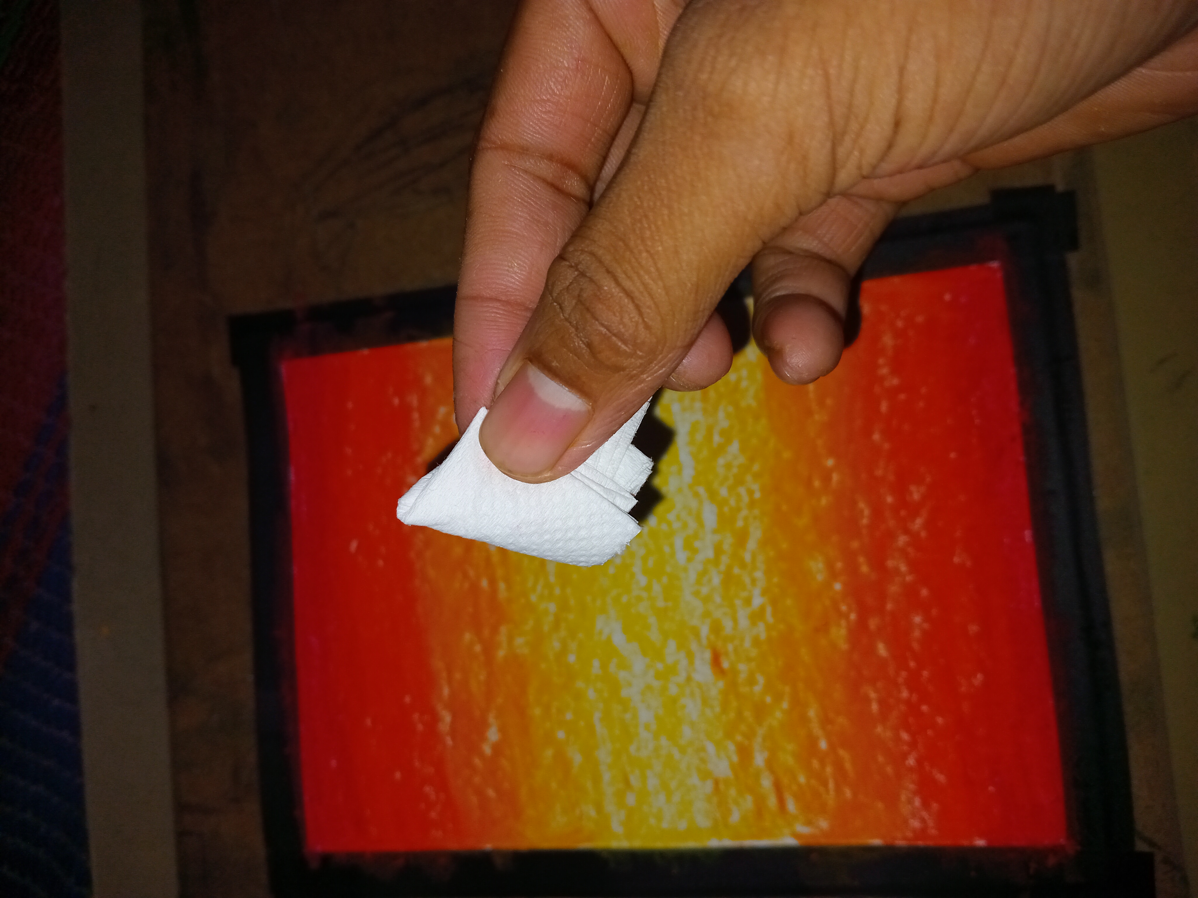Now I took a tissue paper, fried it and rubbed it well on the color so that the color blends well everywhere without any shade being discernible.